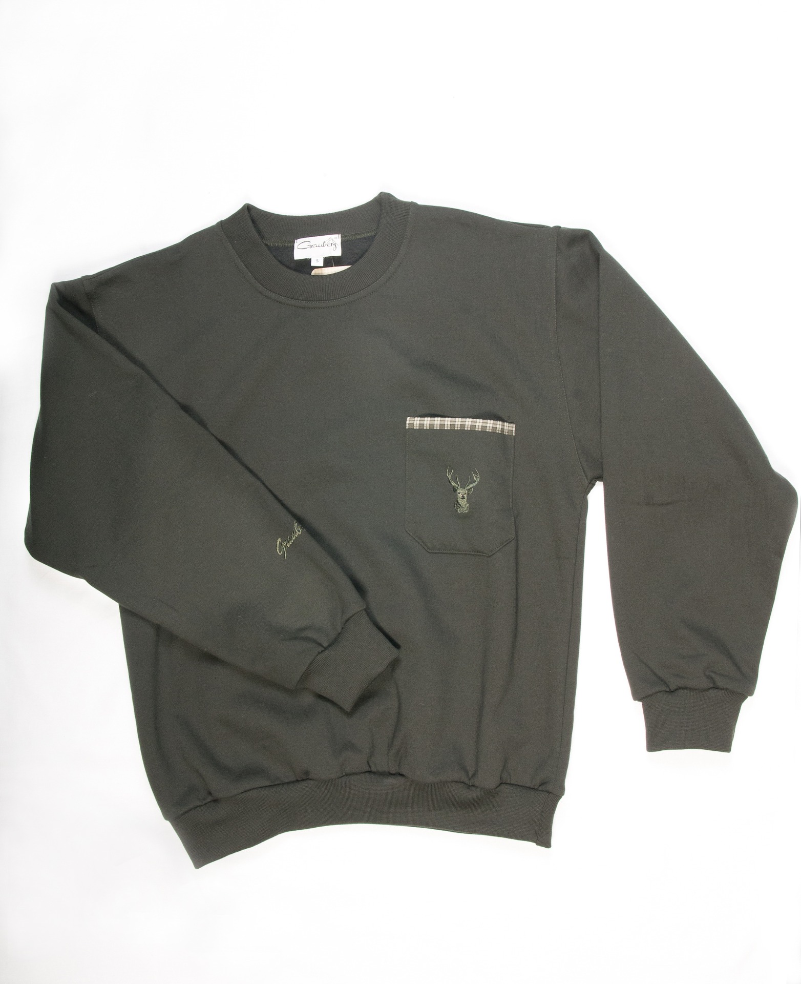 Pamut pulóver ,környakú,zsebén szarvasfej hímzéssel.   Kellemes ,kényelmes viselet egész nap . Mérettartó.