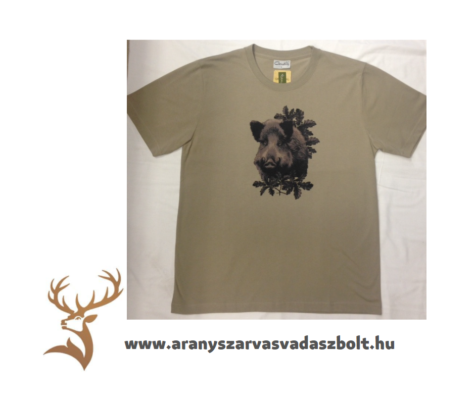 Drapp póló ,vaddisznó mintával .Anyag összetétel:65%pamut,35%poliészter.Kényelmes,kellemes viselet egész napra.Rendelhető méretek:M,L,XL,XXL,3XL. Magyar termék.