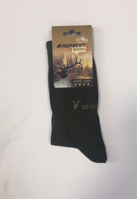 Zöld zokni St. Hubertus  díszítéssel,bokán és a lábfejen könnyített gumírozással. Ajánlott a könnyen bedagadó lábakra.